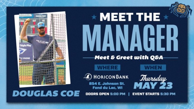 The doors for the event will open at 5:00 p.m. with complimentary light snacks available. Coe will be available for photos and autographs from 5:00-5:30 p.m. The program will begin at 5:30 p.m. and admission is FREE. The first 100 fans at the event may enter to win a Horicon Bank VIP Suite for a 2024 home game! Weaver, the Dock Spiders fun-loving mascot, will also be available for photos with fans who attend the event.
